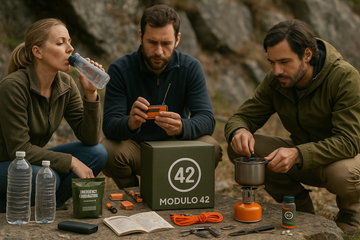 El Kit Intermedio 42 llega para llevar tu preparación un paso más allá: encontrarás una botella con filtro integrado para potabilizar agua de cualquier fuente, raciones liofilizadas y conservas que aseguran la energía necesaria durante días, y un hornillo portátil acompañado de dos cartuchos de gas para cocinar sin electricidad. También incluye un panel solar plegable de 21 W capaz de recargar tus dispositivos, un cargador de coche 12 V a USB para aprovechar la batería de tu vehículo, y una batería externa de alta capacidad que te ofrece múltiples recargas adicionales. Para mantener la higiene en campo dispone de una ducha portátil de emergencia y un WC químico compacto, y para protegerte del frío cuenta con una manta térmica reforzada y un saco de dormir de tres estaciones. Todo ello acompañado de un manual extendido que te guía paso a paso para gestionar hasta siete días sin red.