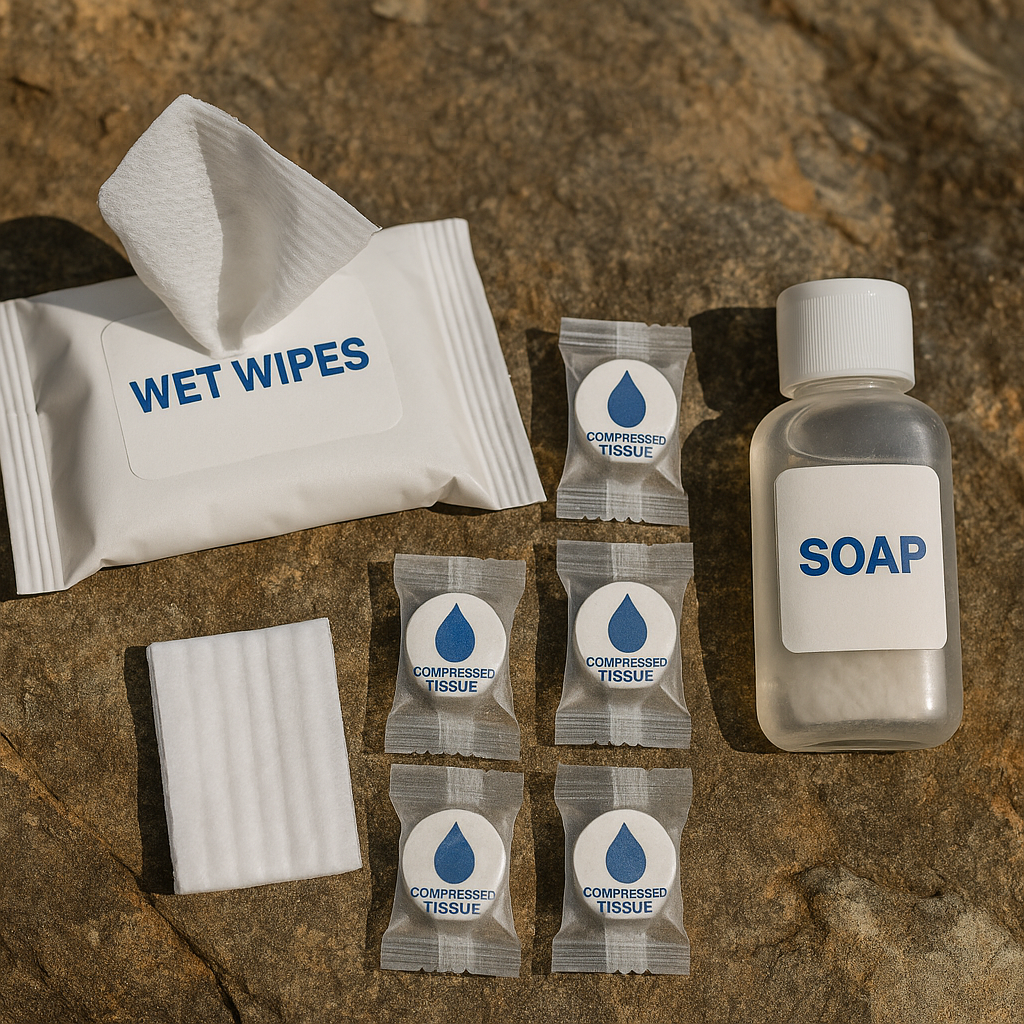 • Kit de higiene compacto: toallitas, papel comprimido y jabón seco para mantener la limpieza.