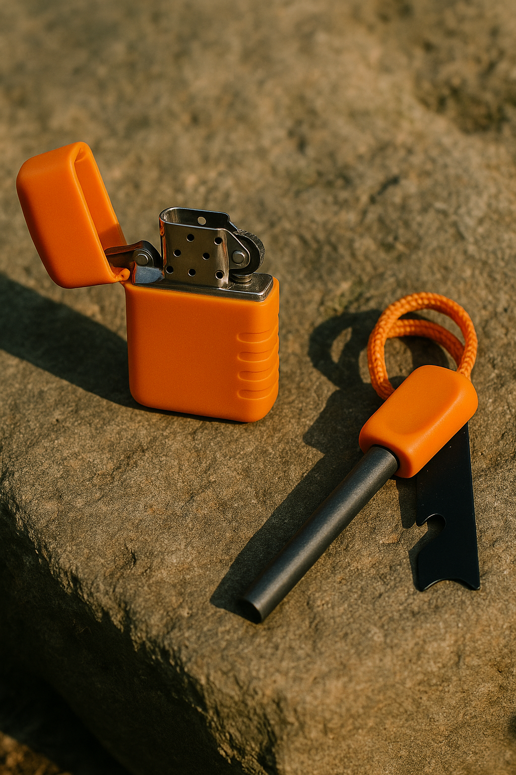 Encendedor resistente al viento con carcasa de aluminio anodizado en color naranja de alta visibilidad. Diseñado para ofrecer llamas estables y controladas incluso con ráfagas fuertes de aire, este encendedor es el compañero ideal para encender fogatas, hornillos portátiles o velas de emergencia en cualquier condición meteorológica.