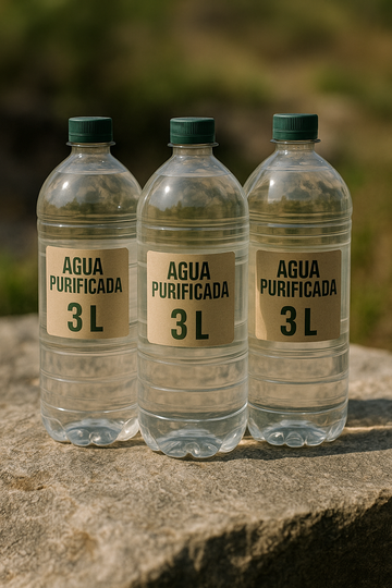 Agua purificada 9 L para emergencias. Tres botellas de 3 L de agua potable, embotellada y sellada, esenciales para mantener tu hidratación durante 72 horas. Las botellas cuentan con tapones de seguridad y etiquetas informativas. Ideales para cortes de suministro, desastres naturales o actividades al aire libre.