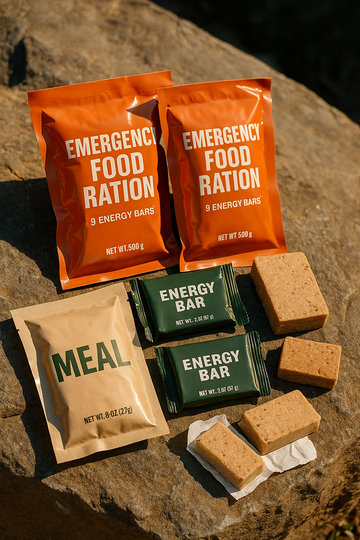 Raciones energéticas de emergencia – 9 unidades (500 g). Tres sobres de “Emergency Food Ration” con 3 barritas energéticas cada uno, más 3 pouches de comida “Meal” liofilizada, diseñadas para aportar 2.000 kcal diarias. Sabor neutro, ricas en carbohidratos y proteínas, y con una vida útil de 5 años.