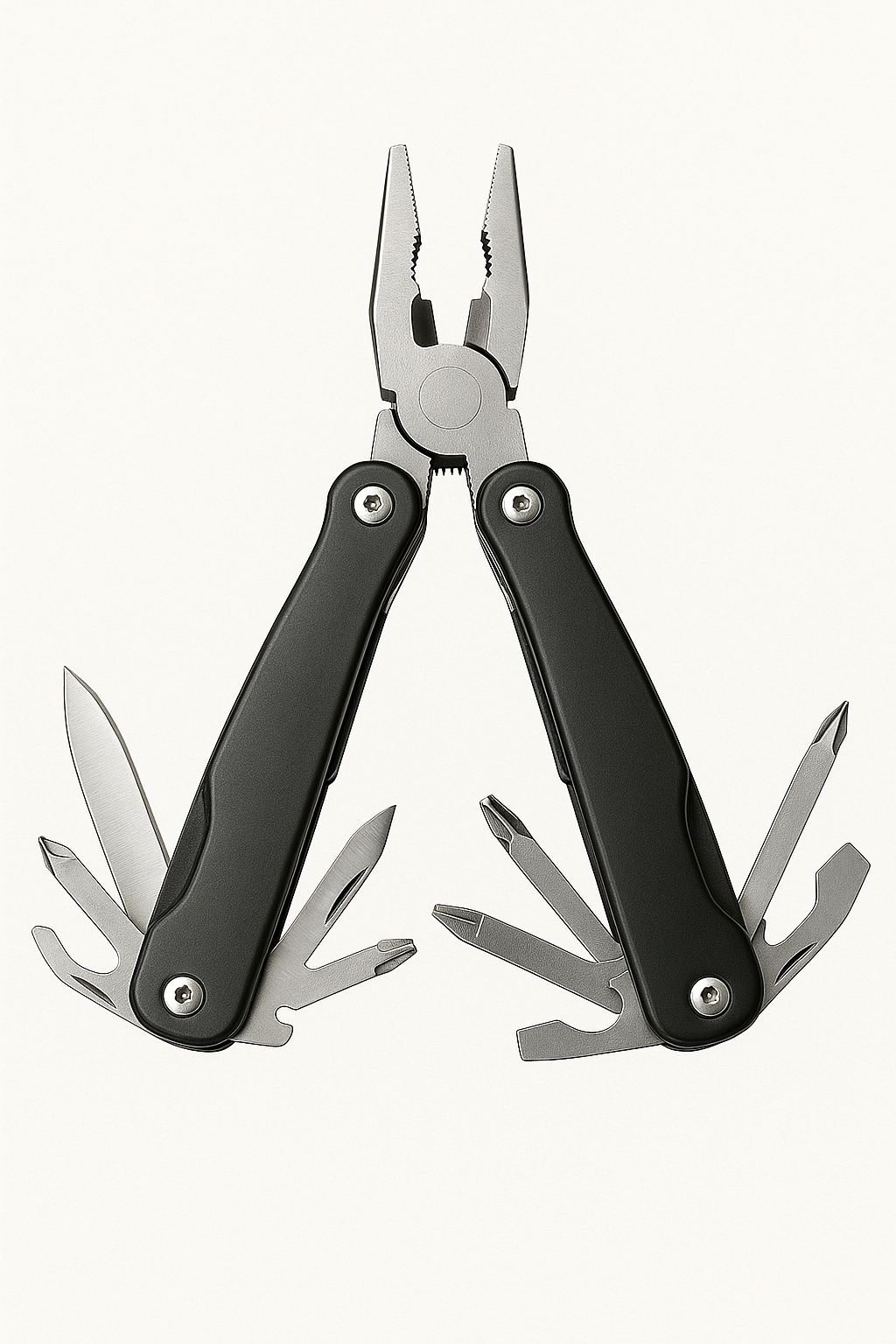 Multiherramienta 11 en 1 de acero inoxidable. Incluye alicates, cuchillo, sierra, destornillador plano y Phillips, abrelatas, pelacables y más. Mango ergonómico con grip antideslizante y cierre seguro. Ideal para reparaciones rápidas y uso versátil en exteriores.