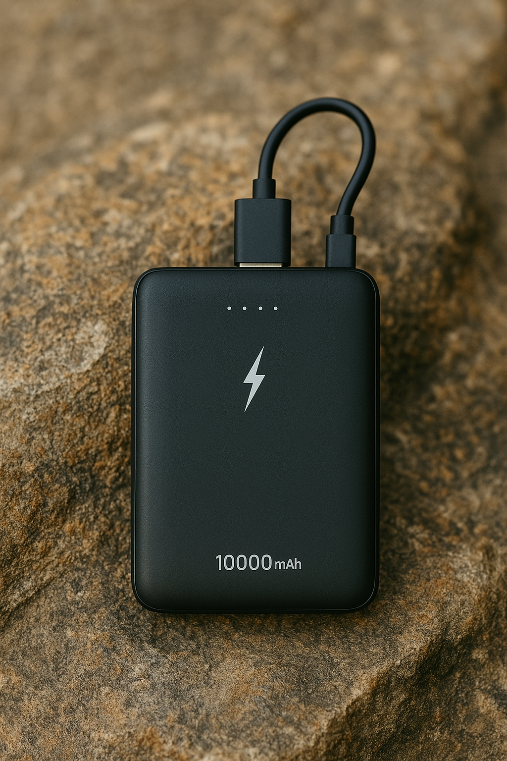 Batería externa 10 000 mAh para emergencias. Powerbank de alta capacidad en carcasa de aluminio resistente, con indicador LED de carga y puerto USB-C. Permite recargar smartphones hasta 3 veces o alimentar linterna/radio en cualquier situación.